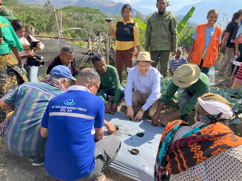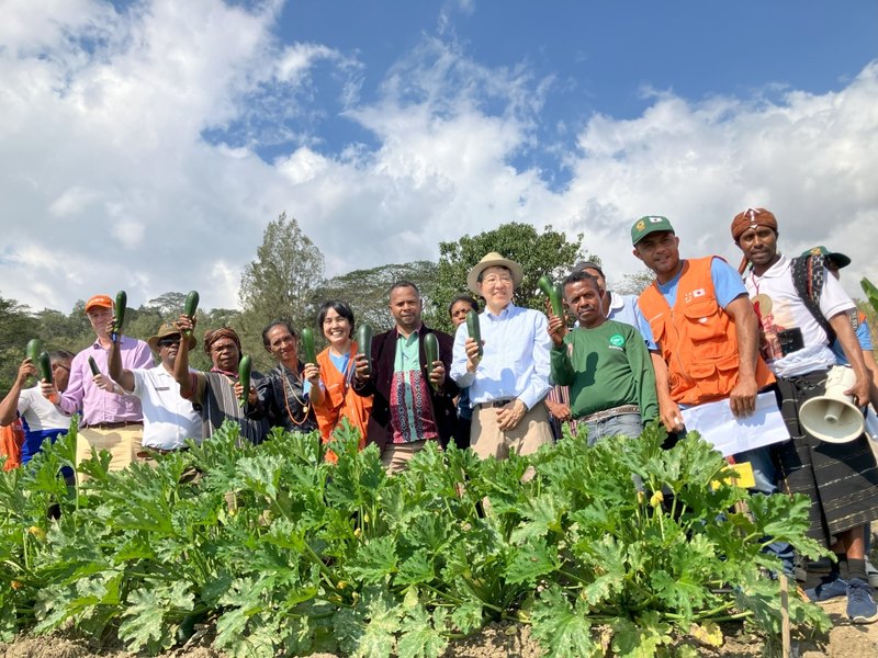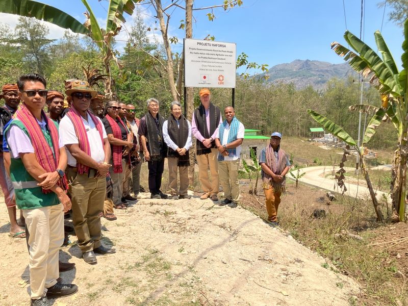 今般、完成したコミュニティー道路のお披露目、女性のVSLAメンバーによる収入向上活動としてのお菓子づくりの視察、研修用農地の見学などを行い、事業の成果を木村駐東ティモール日本国大使、上田INPEX現地代表、オリヴェイラ・アッサベ郡長をはじめとする東ティモール政府関係者にご紹介しました。