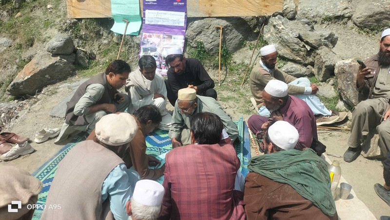 2025年1月、パキスタン北部での水力発電装置復旧工事に向けて、AAR職員と現地住民がミーティングを行い、工事における役割分担や必要資材(砂利・石材など)について話し合い、住民主体でスケジュールや予算を含む計画を確認しました。