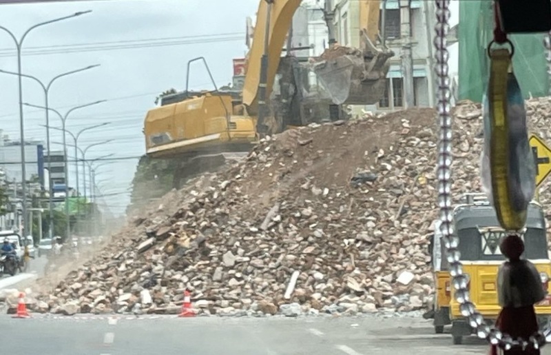 しかし、道路の両側には崩壊した建物の解体で出たがれきの山が連なり、改築に使う土砂や建築資材が積まれたままです。車の窓を開けると、街全体で進む復旧工事のためか、ほこりっぽくて目が痛く感じました。学生が多い地区にある食堂では、売り上げが半分に落ちたままだといい、人々の商売への影響が今も続いています。