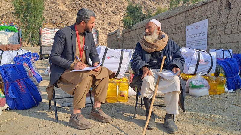 AARカブール事務所の現地スタッフは2025年11月4日から3日間、被災地の対象世帯のうち、地震後の生活の困難について聞き取り調査を行い、物資配布について説明しました。その後、2カ月分の食料、石けんのパック、毛布3枚を配布しました。また、視覚障がいのある方々には白杖(はくじょう)も提供しました。