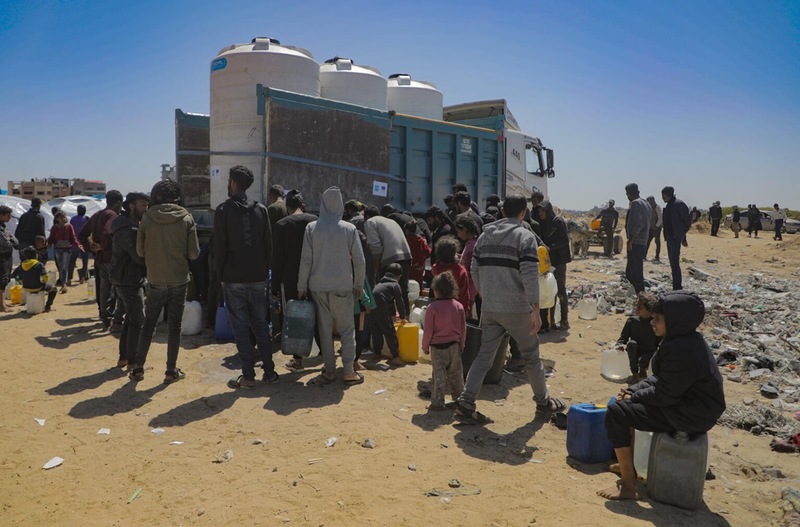 上下水道の破壊などによる断水が続くなか、ユニセフは、現地の淡水化プラントと協力して、海水を真水に変え、タンクに詰めて、各地の避難所周辺に届けています。この夏は、パートナー団体とともにガザ地区内の1,300カ所以上に給水車を出動させました。