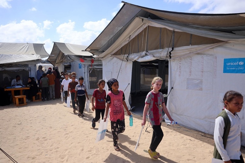 100万人近い子どもたちとその家族が、安全を求めてガザ地区内で避難をくり返しています。ユニセフは、大規模な避難が発生するたび、迅速に新しいテント教室を立ち上げ、子どもたちが避難先で少しでも安全に過ごせる場所を提供できるように努めています。