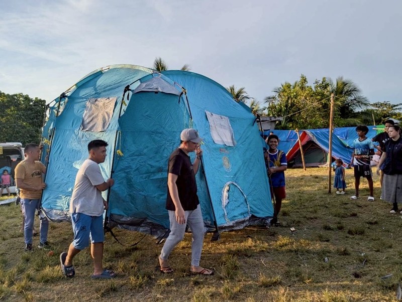 雨風をしのぎ、少しでも安心して過ごせる場所を確保できるよう、PBVは現地パートナー団体の「Balay Mindanaw Foundation Inc(BMFI)」とともにメデリン地区内の自主避難場所にテントを設置しました。