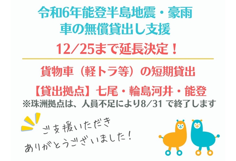 輪島河井、能登、七尾拠点での短期貸出しは延長になりますが、珠洲拠点は現地の人手不足により各方面にもあたりましたが、今月末の8月31日で終了することになります。