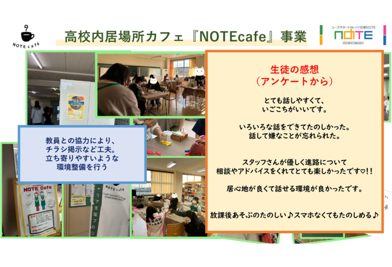 放課後の時間帯に、学校の中で気軽に過ごせる「高校内居場所カフェ(NOTECafe)」は、石巻エリアを中心に宮城県内9校にまで広がりました。