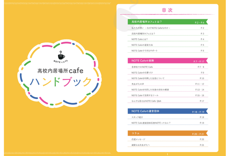 現在、特に力を入れている取り組みのひとつが、高校内に開設している「居場所カフェ(NOTECafe)」です。2023年には、これまでの実践をもとに活動のノウハウをまとめた『高校内居場所カフェハンドブック』を制作・無料公開し、全国の教育・福祉関係者に広く共有しました。