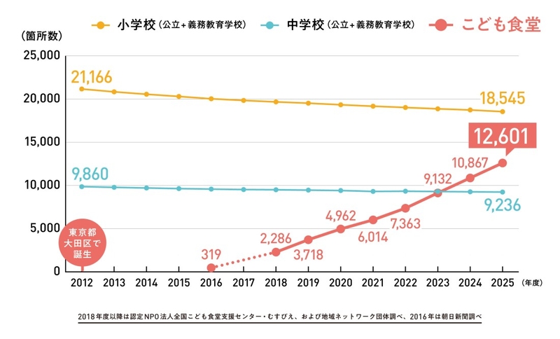 2025年度の調査から、こども食堂は全国で「1万2,000カ所」以上あることがわかっており、その数は、公立の小学校・義務教育学校を合わせた数(1万8,545校)の7割に近づいています。