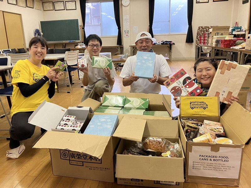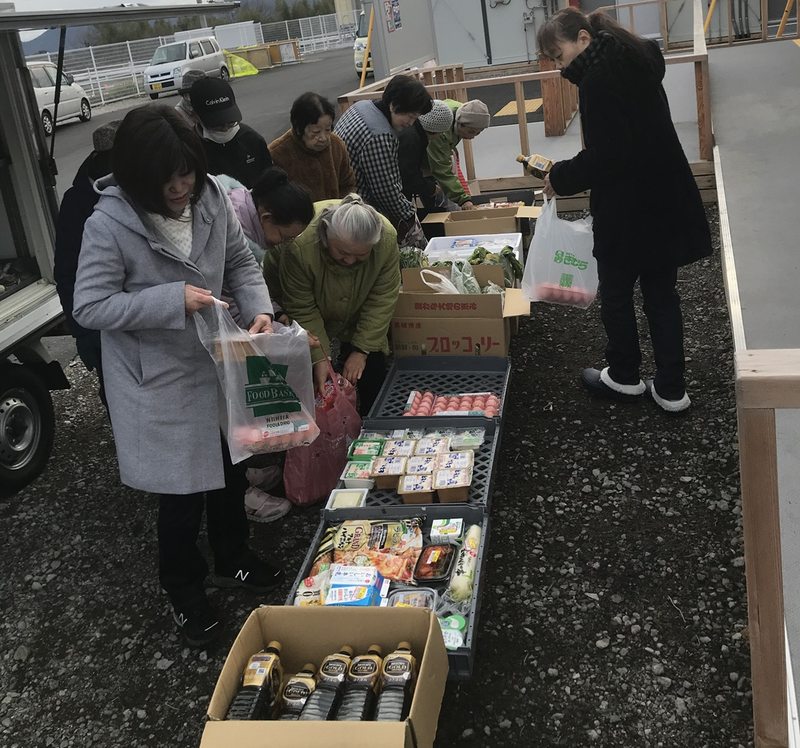 2018年の西日本豪雨では、真備町など6カ所の仮設住宅で「無料スーパー」を23回開催し、420世帯に約3トンの食品を提供しました。