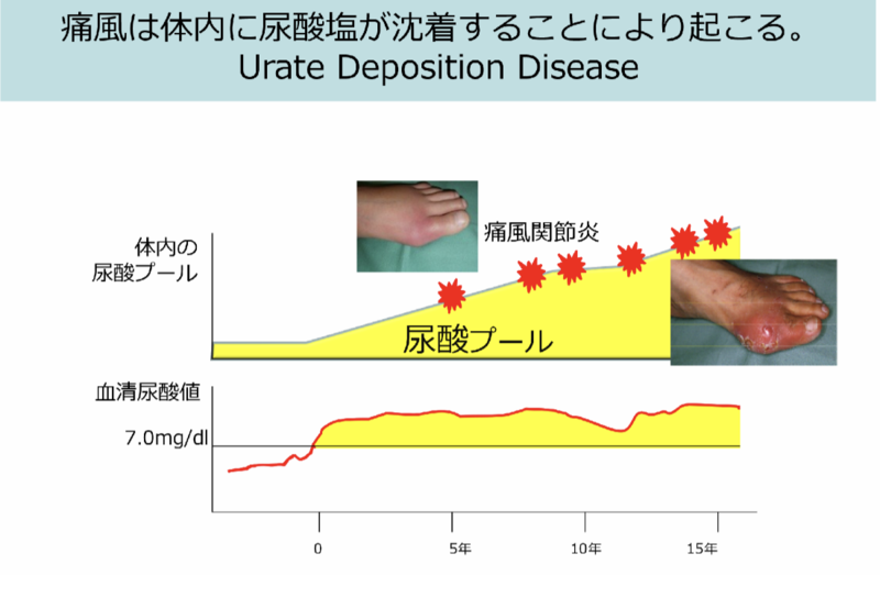 痛風患者や予備軍が急増しております。厚生労働省の調査では、痛風患者数は約16万人程度とされていますが、実際の痛風患者数は130万人、痛風予備軍(尿酸値の高い高尿酸血症の人)まで含めると1,000万人前後にも上るとみられております。