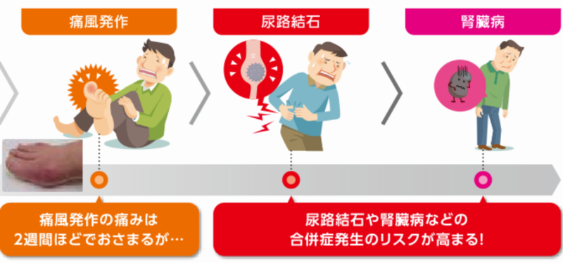 痛風の症状はある日突然、足の親指などの関節が腫れて激痛におそわれる発作がおきる病気です。痛みは徐々にやわらいできますが、この状態を放置しておくと、さまざまな合併症を引き起こしてしまいます。高尿酸血症・痛風は関節炎、尿路結石症、痛風腎のみならず、脳・心・腎・血管障害に深く関わってまいります。
