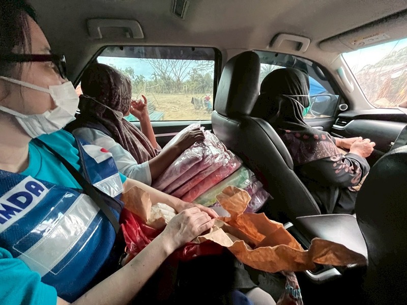 2025年12月19日、アチェ州アチェ・タミアン県のパブリックヘルスセンターの助産師・看護師とともに地域を回り、蚊帳27張り、毛布20枚、敷物10枚、ロウソク1箱を、必要とする被災者の方へ配布しました。