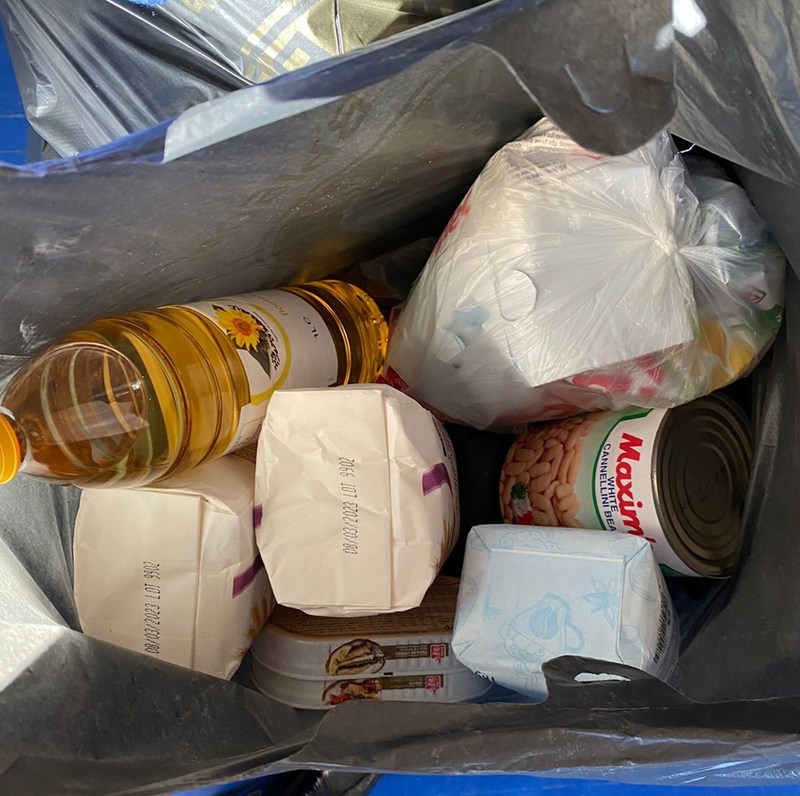 小麦粉、豆の缶詰、魚の缶詰、食用油、砂糖、塩など