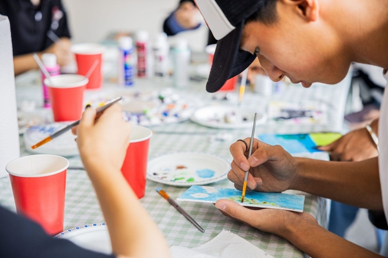 子どもたちはファシリテーターの導きのもと、絵具を使ったペイントを通じて自身の内面を表現。体験型ワークは二つのステップに分けられ、まずはキャンバスに「自分の軸となるもの」を描きました。その後、「仮面」をペイントしながら、自分の外側(人から見られる自分)と内側(自分から見た自分)について考える時間がありました。