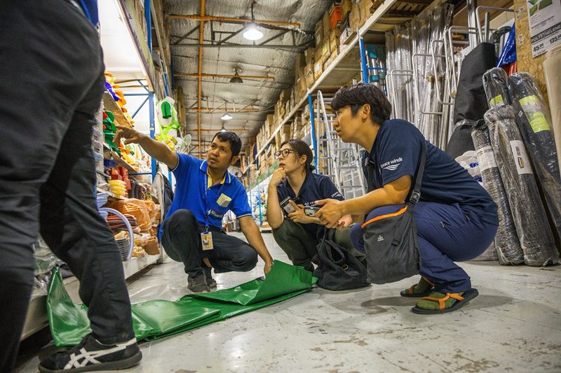 物資を届けると被災者たちが自ら手際よくテントを補強したりタープを張ったりしていきます。ひとつのテントを複数の家族でシェアしたり、雨が降れば雨漏りしたり、テントやタープの外にあったものを急いでテント内にしまわなければならない状況でしたが、雨をしのげる空間が少しでも広がることで、こうしたストレスを少なからず解消できるといいます。