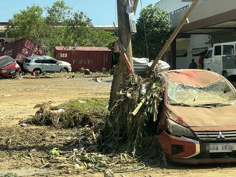 セブ島北部から中心のセブ市に向かう途中にある、幹線道路沿いの町Liloanでは、道路上にがれきや泥が堆積し、泥だらけになって傾いたりつぶれたりした状態の自動車が多く見られました。